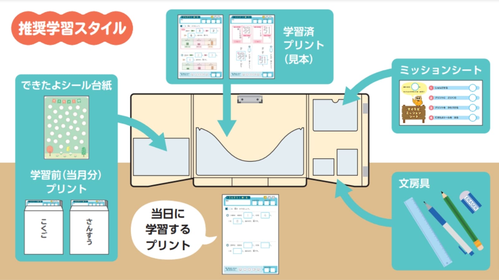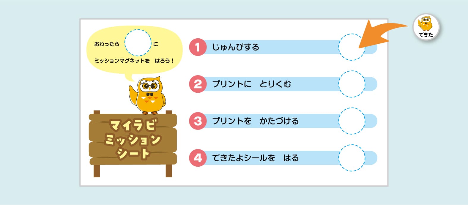 マイラビでは、プリントの準備や最後のかたづけの仕方まで例を示し、学習の一連の流れを習慣化できるようにサポートしています。