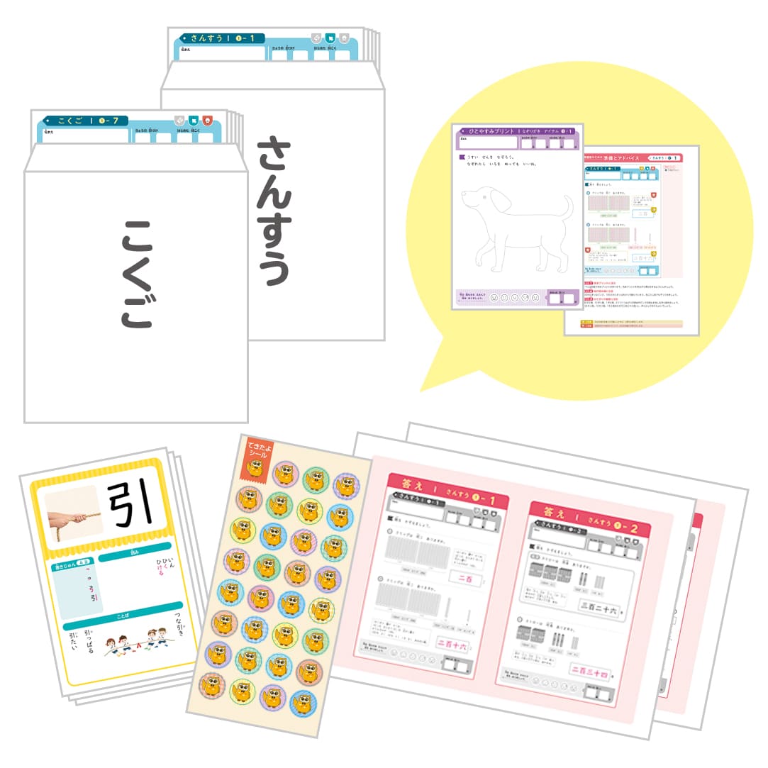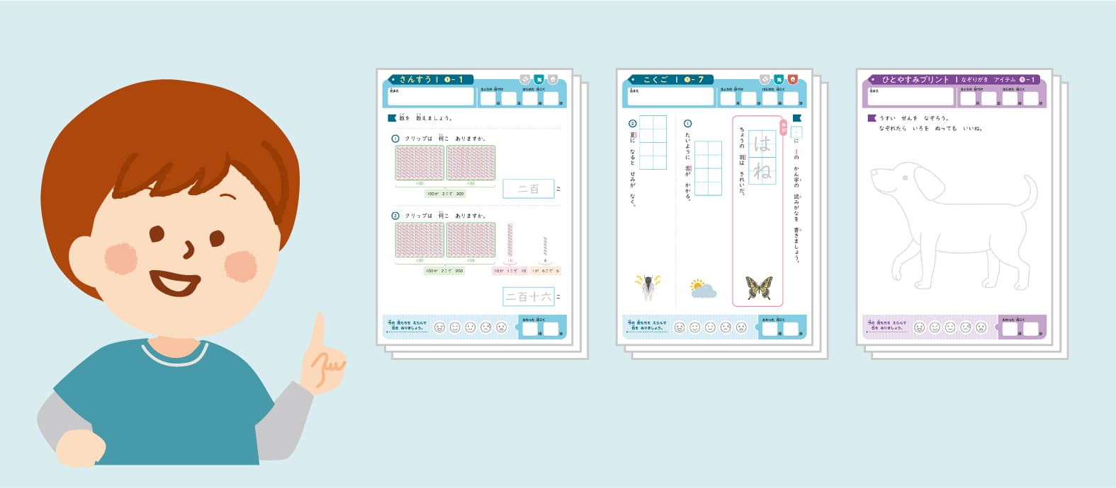 学習量はお子さまの負担にならない、1回15分程度の量。国語と算数のほかに、ぬりえや間違い探しなど、楽しく取り組める「ひとやすみプリント」を用意。気分が乗らないときや集中できないときは、「ひとやすみプリント」だけや国語だけ、算数だけ取り組むのもOKです。